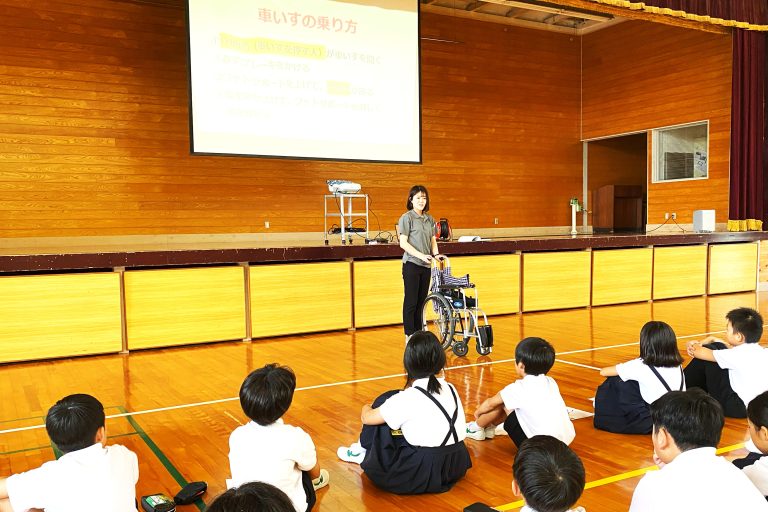 小学生を前に、笑顔で優しく車椅子の使い方をレクチャーする植木さん。